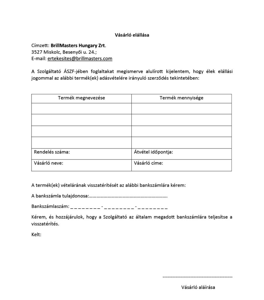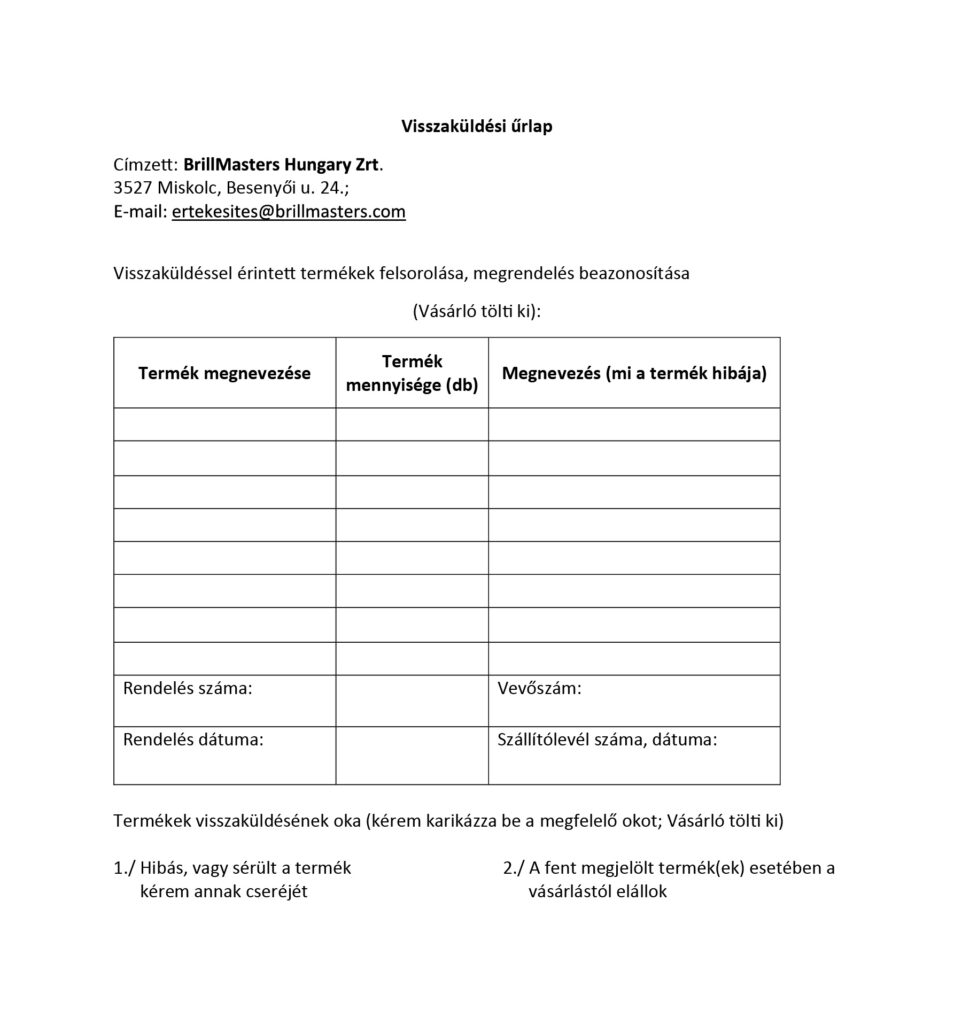 Visszaküldési cím: BrillMasters Hungary Zrt. 3527 Miskolc, Besenyői utca 24.